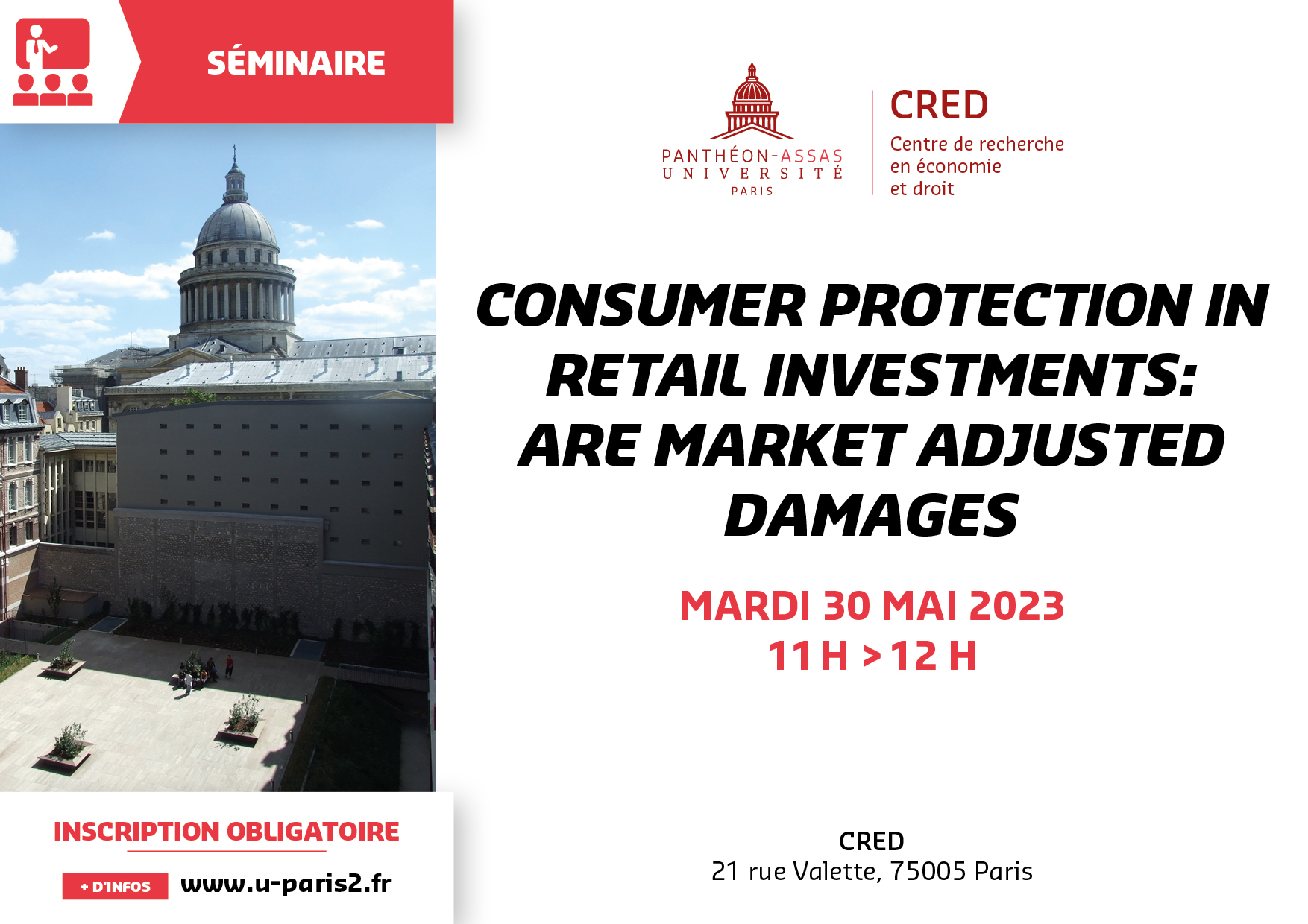 Claude FLUET (Université Laval, CRREP) présentera une communiction intitulée Consumer Protection in Retail Investments: Are Market Adjusted Damages le 30 mai 2023 de 11h à 12h en salle de séminaire du CRED :