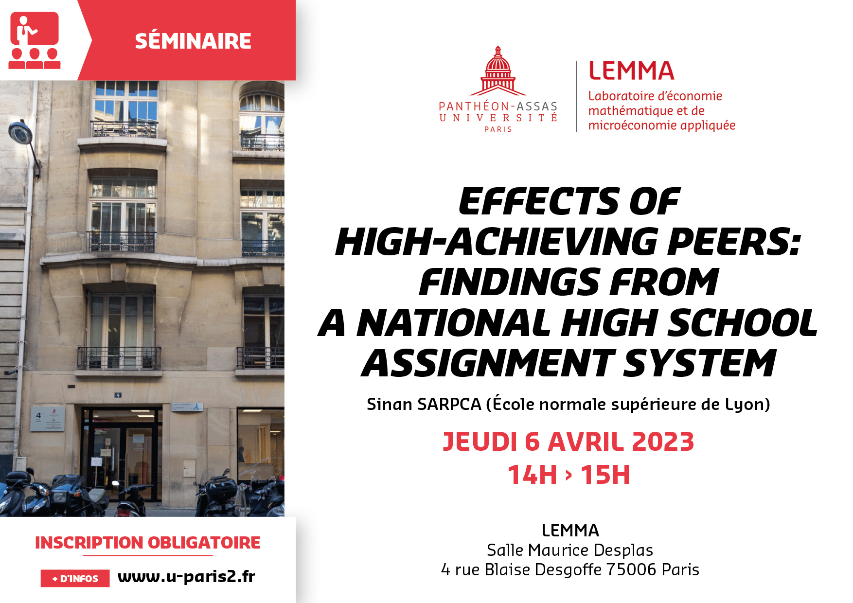 Le Lemma organise un séminaire, sur le thème « Effects of High-Achieving Peers: Findings from a National High School Assignment System » le jeudi 6 avril 2023 à 14h.